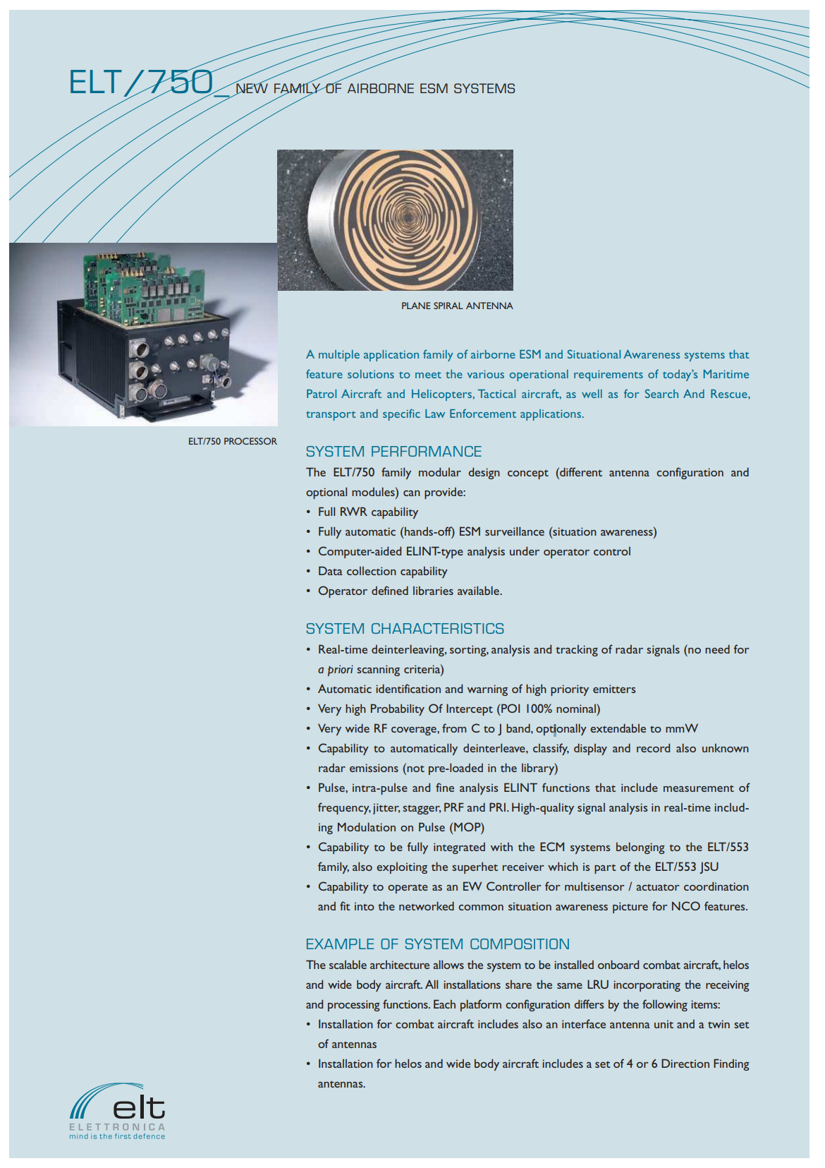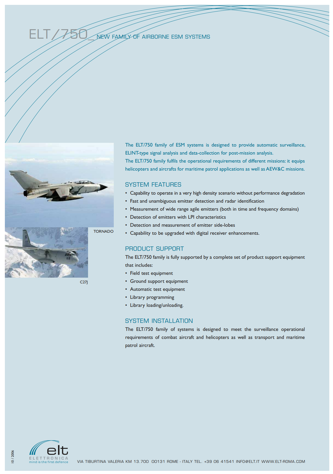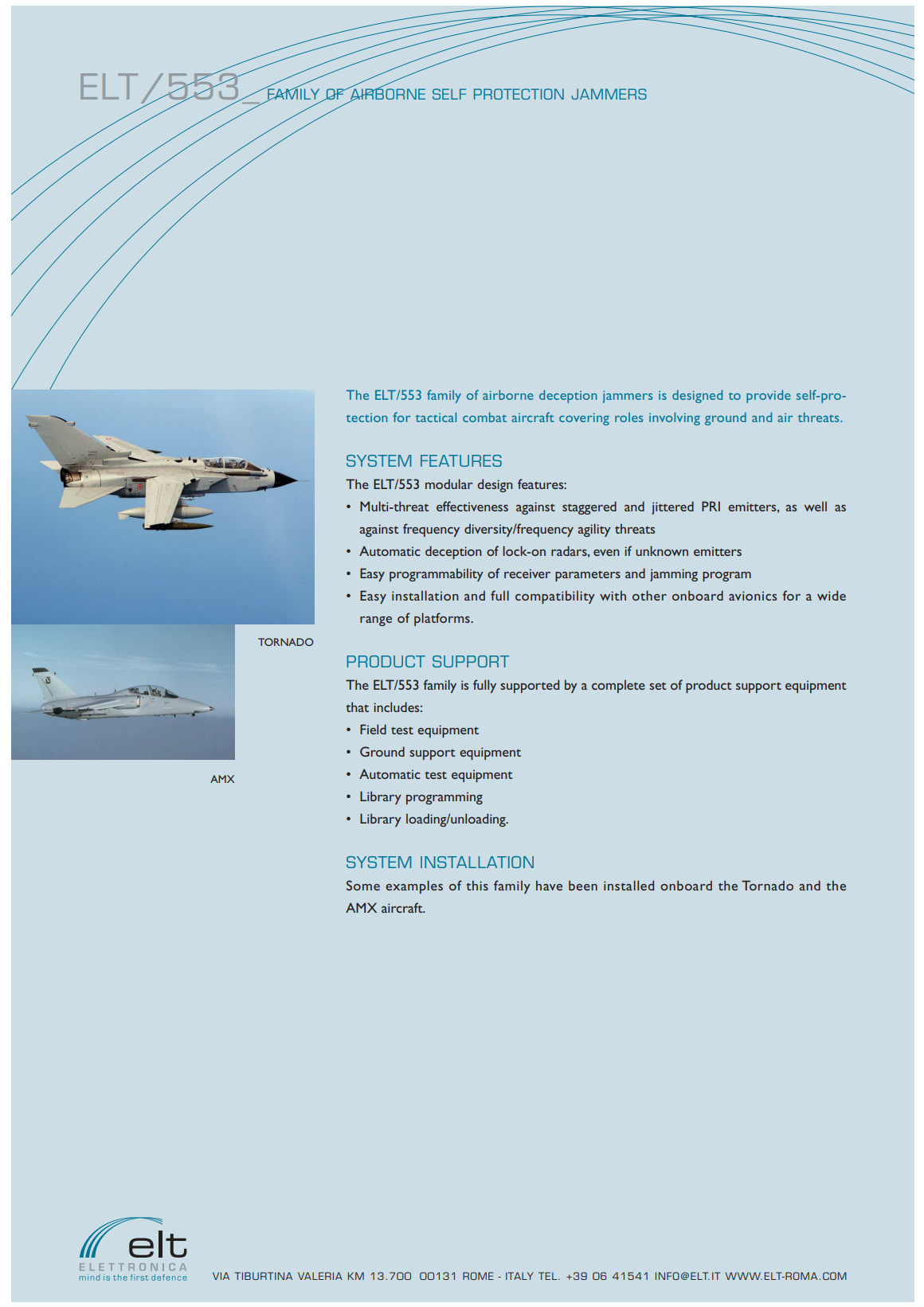 - Elettronica S.p.A – ELT-750 Radar Warning Receiver Brochure confirms that the ELT-750 was integrated as part of Italian Tornado IDS modernization programs. ELT-750 ESM Brochure;