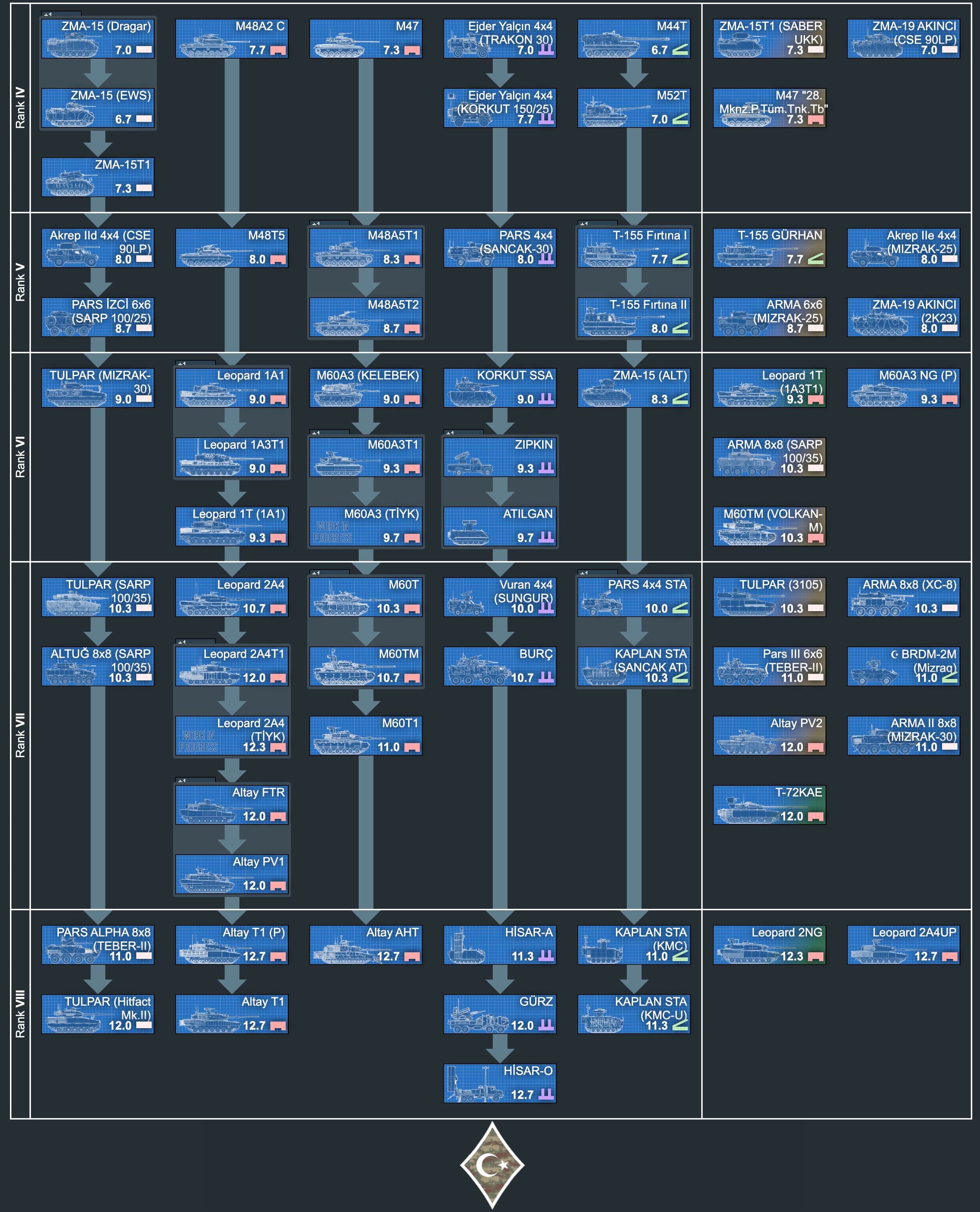 For the time being, tech tree starts from Rank IV, much like Israeli counterpart, and has vehicles all the way down to the Rank VII and we have plans to move some vehicles up to Rank VIII once Gaijin introduces Rank VIII to Ground Forces. You should note that, tech tree is not finalised yet, some vehicles might be added, removed or moved within tech tree. Also more important note, take the BR arrangement of the vehicles with a grain (maybe with a pack ? lol) of salt since some of those vehicles are pretty modern machines and their specifications are classified (do not worry I’m not willing to leak any documents) or do not have proper counterparts to decide fitting BR. You are very welcomed to states your opinion about BRs of vehicles as well as overall Tech Tree.