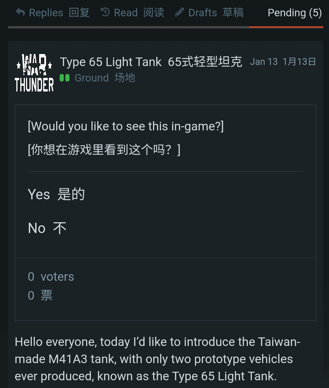 Since 1958, the Republic of China Army has received a total of 700 M41A2/A3 light tanks, along with approximately 300 domestically modified M48A3 tanks, which became the main equipment of various armored brigades, tank groups, infantry division tank battalions, corps armored cavalry battalions, and marine corps tank battalions. In 1975, the military attempted to reverse engineer components of the M41 chassis (pure chassis, excluding the cannon, fire control system, engine, and gearbox) to establish tank development capabilities, and successfully produced the first M41 in 1976.
