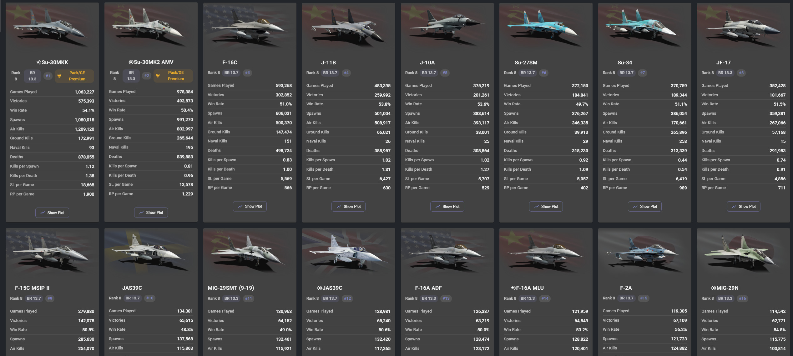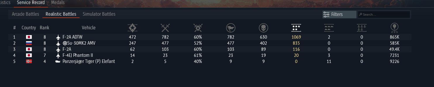 you have NINE VEHICLES in your ENTIRE SERVICE RECORD, and only five in realistic battles, with all vehicles above rank 1 being premium except for the F-2A.