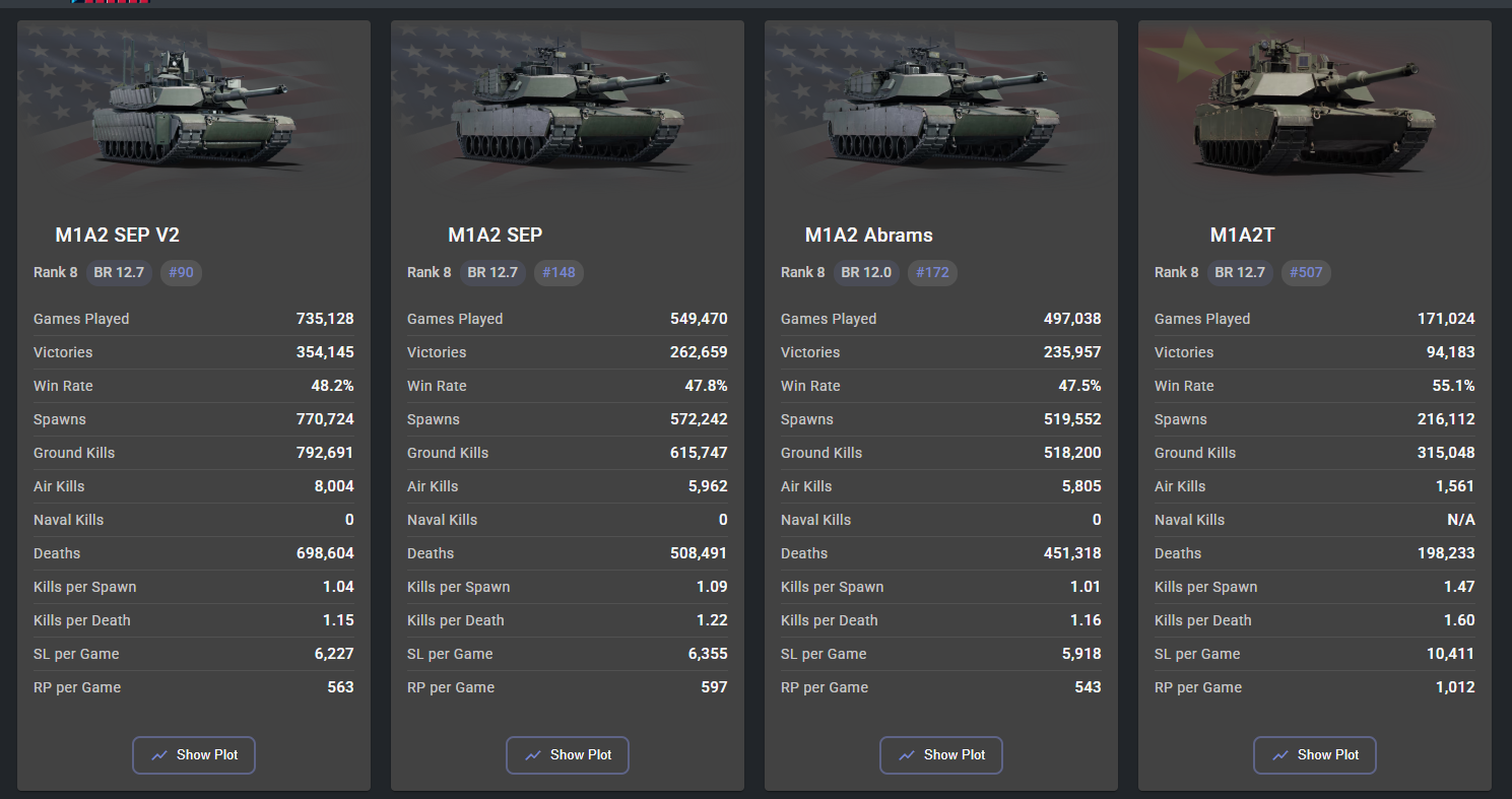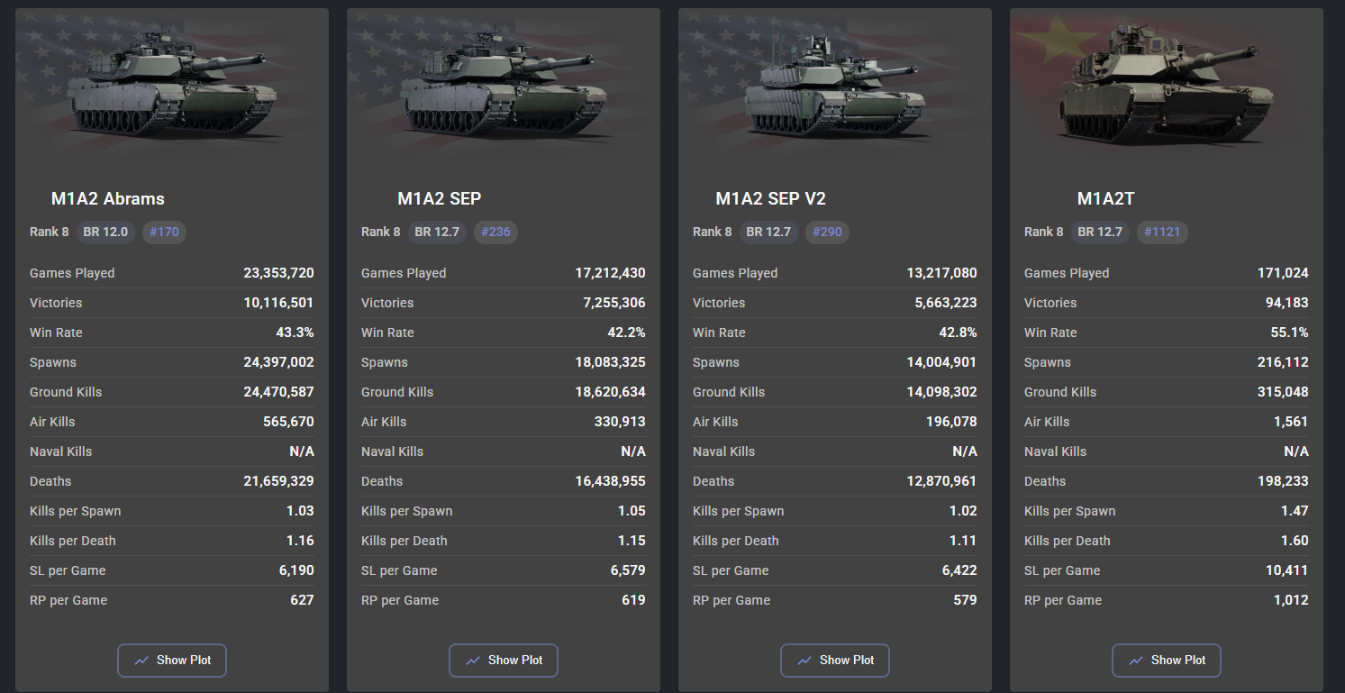 This braindead take again? if you combine the games played of the 2 Abrams tanks at 12.7 for December, You end up with almost 10 times as many games played. games played and the matchmaking of the nation tends to have an effect on stats.