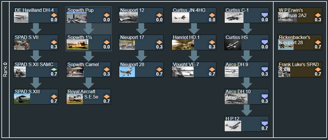 Similar to option 1, this would have the addition of Rank 0 below the current start of the tech tree. It would be placed below reserve aircraft and be optional for players to research and play. It would have battle ratings from 0.0-0.7. I think this would be the most promising personally as again it would be completely optional as some players may not be interested in this era of aircraft. However a problem this would have is the battle ratings would be quite compressed as these aircraft would be limited to a 0.0-0.7 BR range as they are simply leagues behind even the worse reserve aircraft in-game. But this could be solved by adding 1919 and more interwar aircraft to bridge the gap in capabilities.