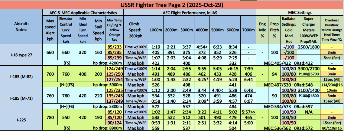 – I-185 (M-71): This planes runs hot. Heat had to be mitigated with Prop90. Prop90 can be used up to 4800m with approx (+2.5/+2.25sec) per 1000m climb time. Prop90 can be used to 4800m, then Prop100 should be used. Fuel: 30min. Engine hp drop: 5300m.