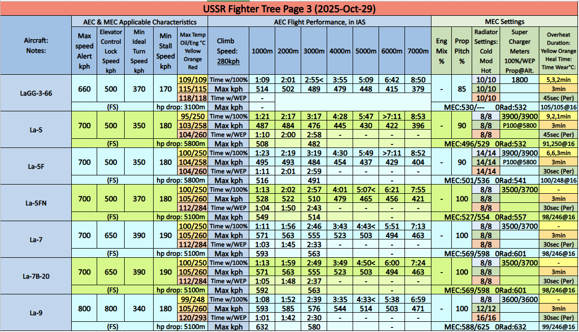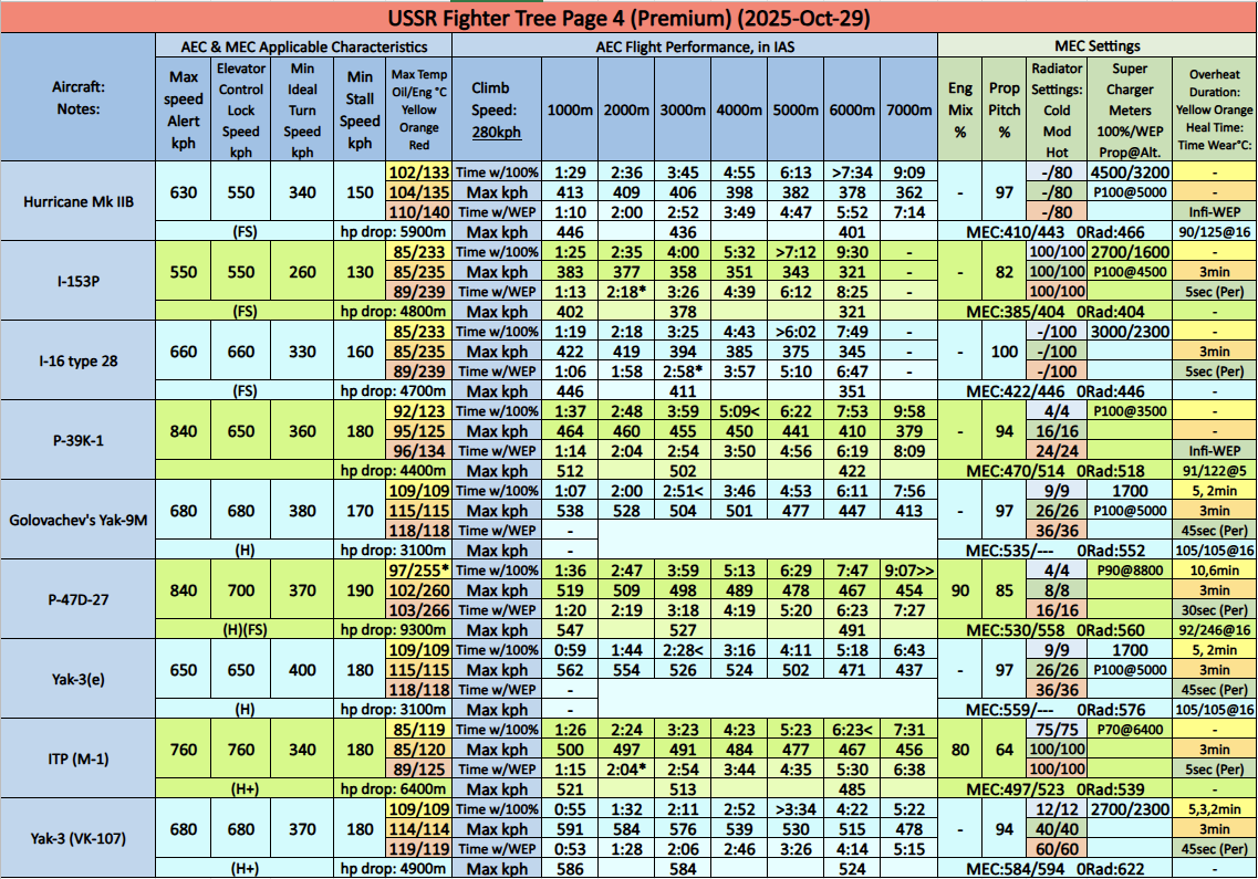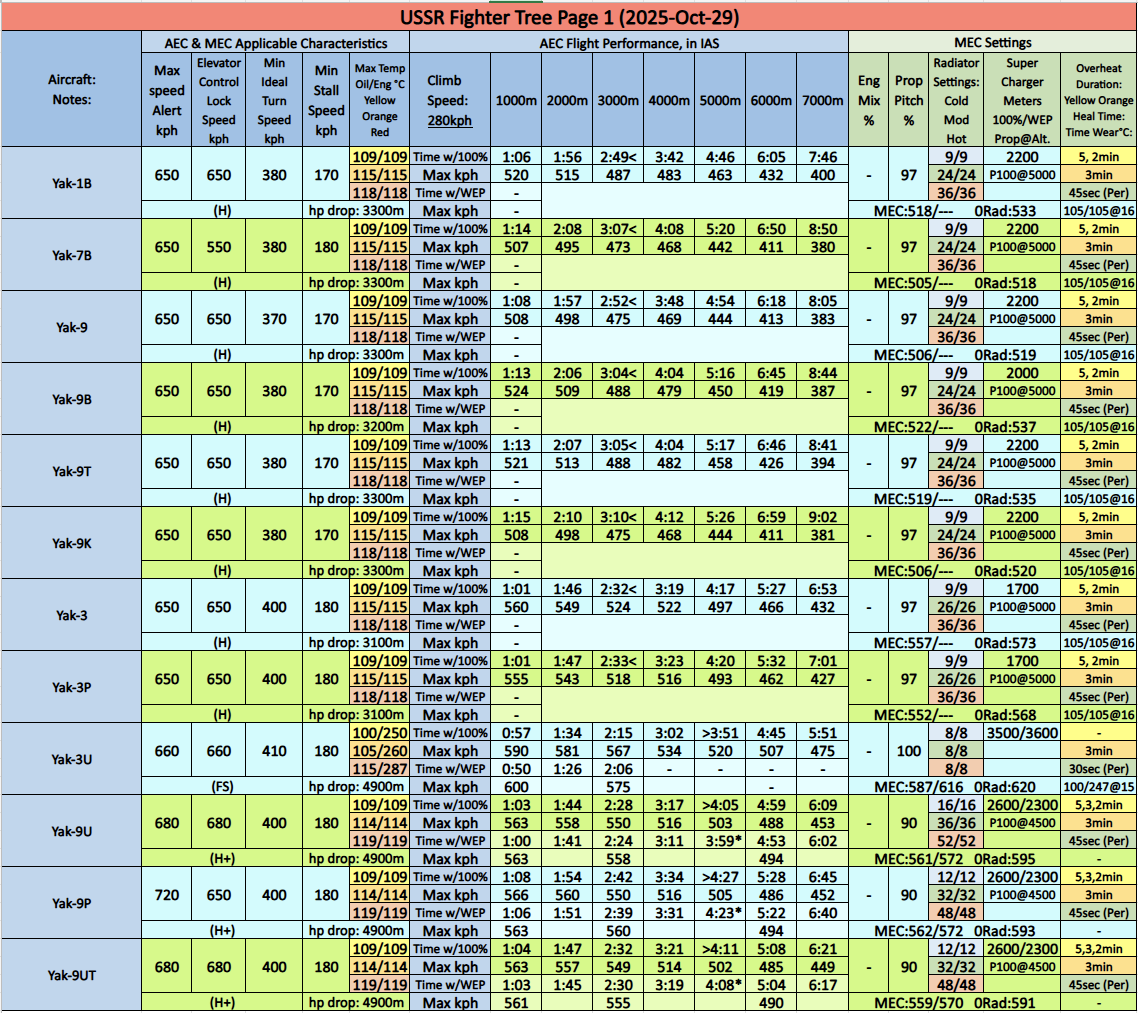 – Yak-1B, Yak-7B, Yak-9, Yak-9B, Yak-9T, Yak-9K, Yak-9M, Yak-3, Yak-3P, Yak-3(e): These planes benefit from MEC over AEC with better cooling preventing overheating. AEC radiators are incorrectly set to 111/111°C instead of 109/109°C causing the planes to overheat. Fuel: 30min.