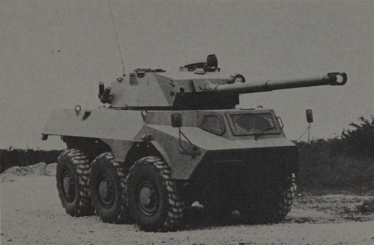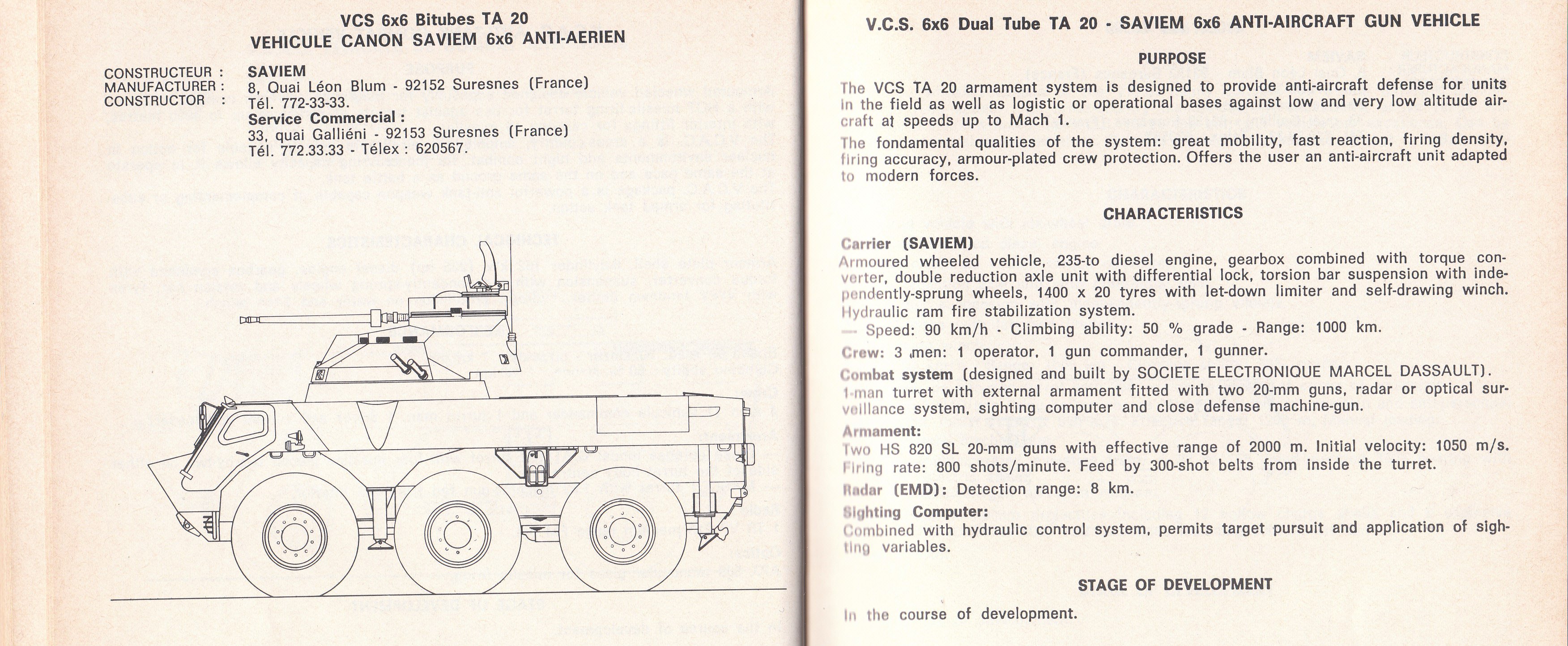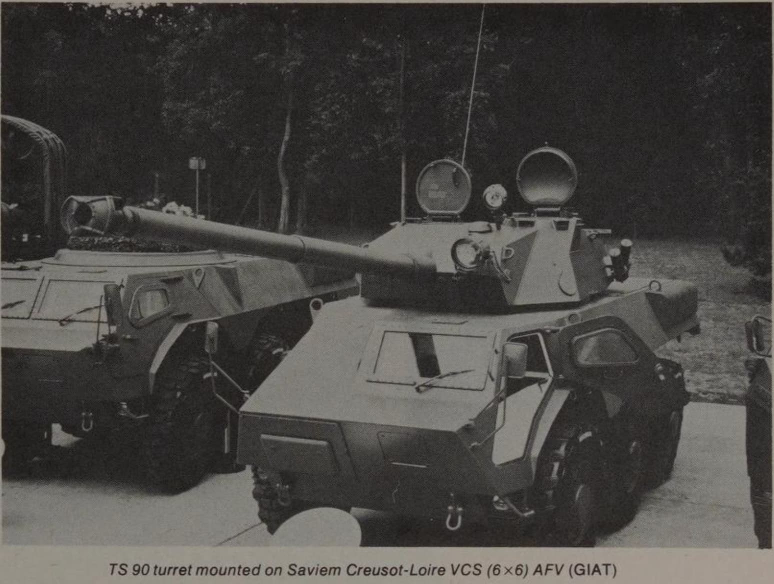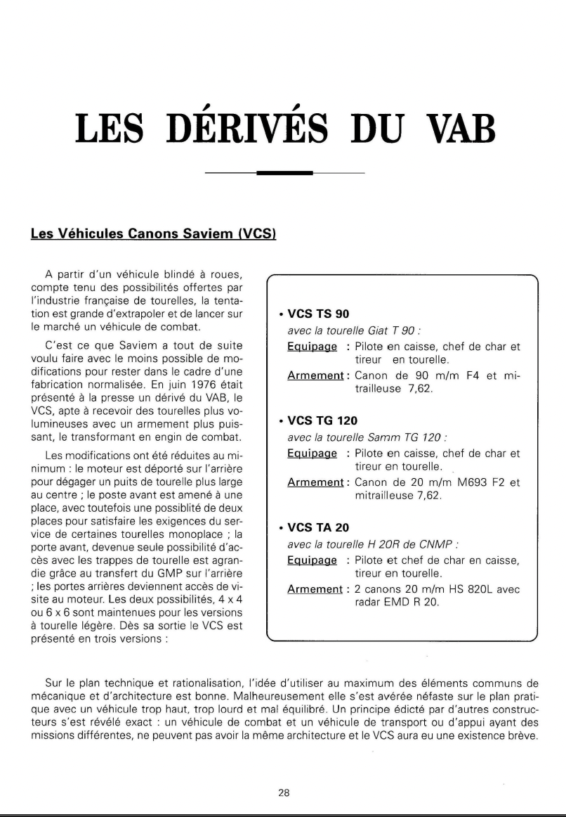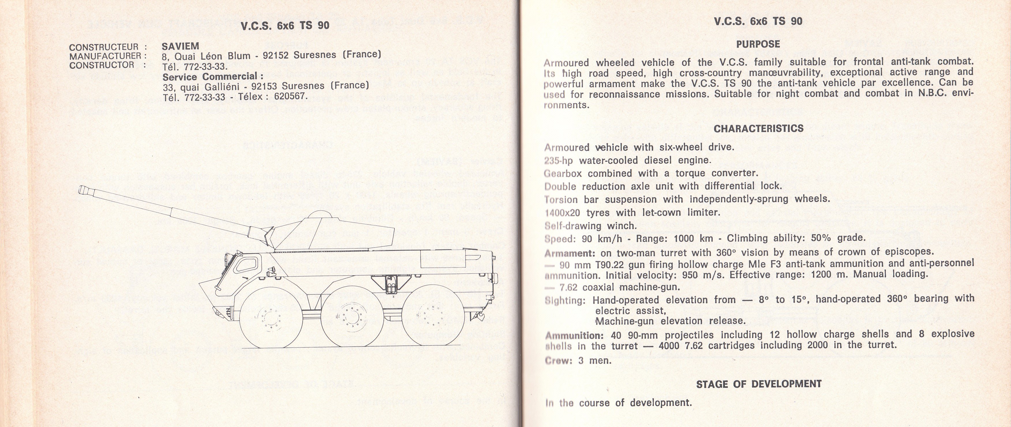 In 1976, Saviem revealed their newest design to the press, the VCS. It was then displayed at Satory VI in 1977. The VCS was a new family of 4x4 and 6x6 vehicles, designed as combat vehicles, based heavily on the VAB. Their 6x6 design was fitted with an early version of the TS 90 turret. Alongside this, they also advertised a 6x6 variant with a TA 20 dual 20mm anti-aircraft turret, and a 4x4 variant with a TG-120 20mm turret. Neither of these appear to have been built, however. The hull was modified minimally from the VAB: the engine was moved to the rear, the two-seat configuration at the front was changed to one seat, and the front door was enlarged.