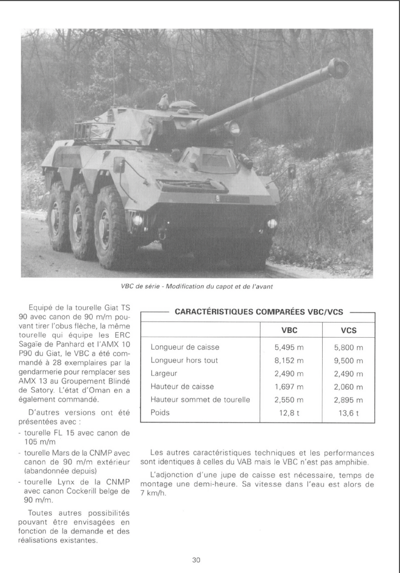 The VCS only appears to have been marketed in 1977–78, and it is unknown what happened to the prototype vehicle, likely disassembled. In 1979, at Satory VII, Renault unveiled the first VBC 90 (Véhicule Blindé de Combat) prototype. The VBC-90 was fitted with the TS 90 turret, as on the VCS, but featured an improved hull front, much closer to the 6x6 VAB design. France quickly took interest in the vehicle, and the Mobile Gendarmerie ordered 28 VBC 90s. The first production VBC 90 was produced in 1981, and first deliveries began in 1983. The variant delivered to the Gendarmerie is sometimes referred to as the VBC 90 G. In 1984–1985, six VBC 90s were delivered to Oman. Both variants used the SOPTAC 11 FCS, fitted with a laser rangefinder.