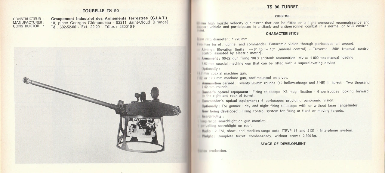 The VCS (TS 90) was fitted with an early model TS 90 turret, armed with a high-velocity 90mm cannon, advertised as the T90.22, an early variant of the CN 90 F4. The cannon was able to fire only HEAT-FS and HE rounds: OCC 90 F2 HEAT-FS penetrates 350mm @ 0° @ 10m. The VCS (TS 90) carried 20 rounds of ammunition in two ready racks (4 in the turret basket, 16 in the turret bustle), and 20 rounds in the hull. It also carried a coaxial 7.62mm with 4000 rounds of ammunition, 2000 of which were stored in the turret.