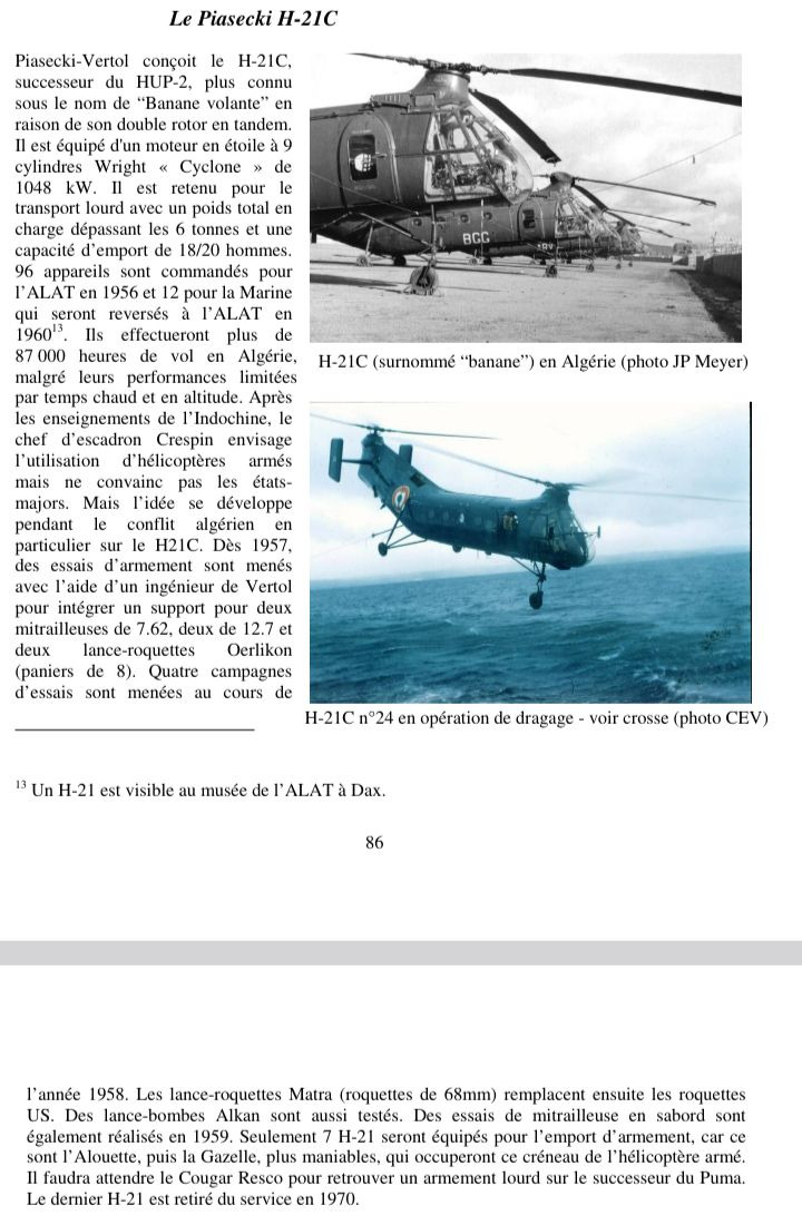 During the Algerian War, the French forces had various aircraft at their disposal, but these were all first-generation models and lacked the power to carry out all their missions. Therefore, the French General Staff turned to the H-21C, which was then one of the most modern helicopters in the world and also boasted a significant transport capacity. 108 aircraft (FR1 to FR108) were purchased from the United States, and an aircraft carrier was dispatched to transport them directly to the theater of operations. 88 H-21Cs were delivered to the French Army Light Aviation (ALAT), and 19 to the French Navy (the last one serving as a test aircraft). Within ALAT, all the aircraft were operated by Helicopter Group 2 (GH2) and participated in a large part of the operations in Algeria, demonstrating their robustness and effectiveness, which far surpassed other helicopters of the time. However, the aircraft also showed some weaknesses, particularly concerning its engine and its resistance to the desert heat. Following the war, the remaining H-21Cs were repatriated to France and used for various logistics missions within the country. It is worth noting that H-21Cs were used during various French nuclear tests in the Sahara. The last H-21Cs were withdrawn from service during the 1970s, after nearly 20 years of service.