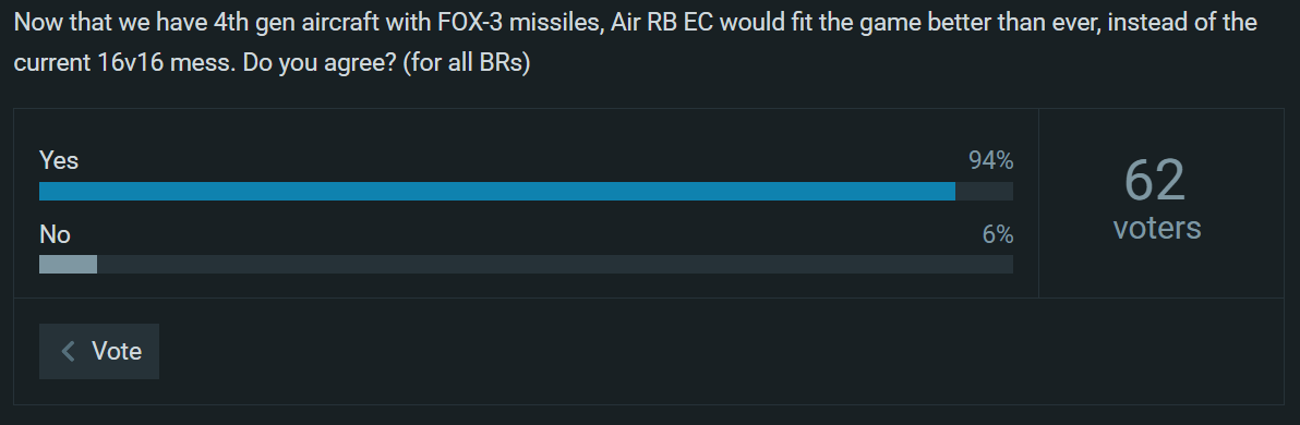 It’s not like I took responsibility and voted to have match ups like T-54 vs XM1, Tiger II vs Jumbo/Sherman, witness what Su-33s do in their own tier or downtiers, Phantoms/MiG-23 vs F-15s, 16s, 18s, Russian GRB 10.3s…, T-55 vs T-80, AFT09 at 9.0, we could probably spend all day talking about similar matchups.