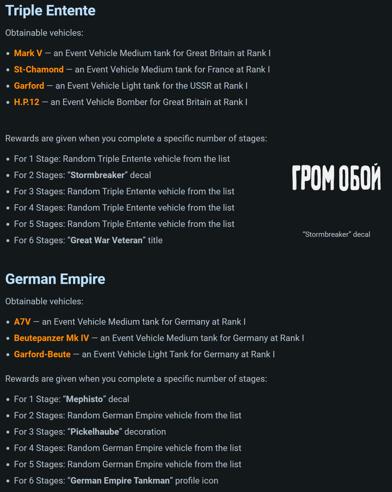 Still waiting. I unlocked all WW1 vehicles and still want them to have their Great War event tag.