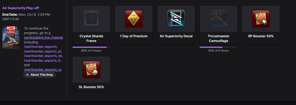 - About 16 hours ago, the War Thunder items were added to my Twitch inventory after watching the eligible streams.