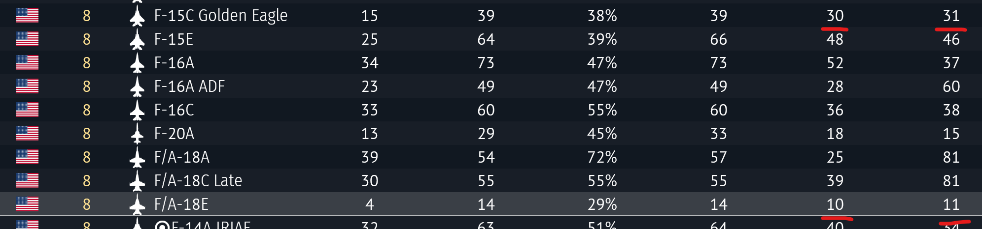 The F-15E’s KDR also jumped from 0.46 to 0.95 since I spaded it.