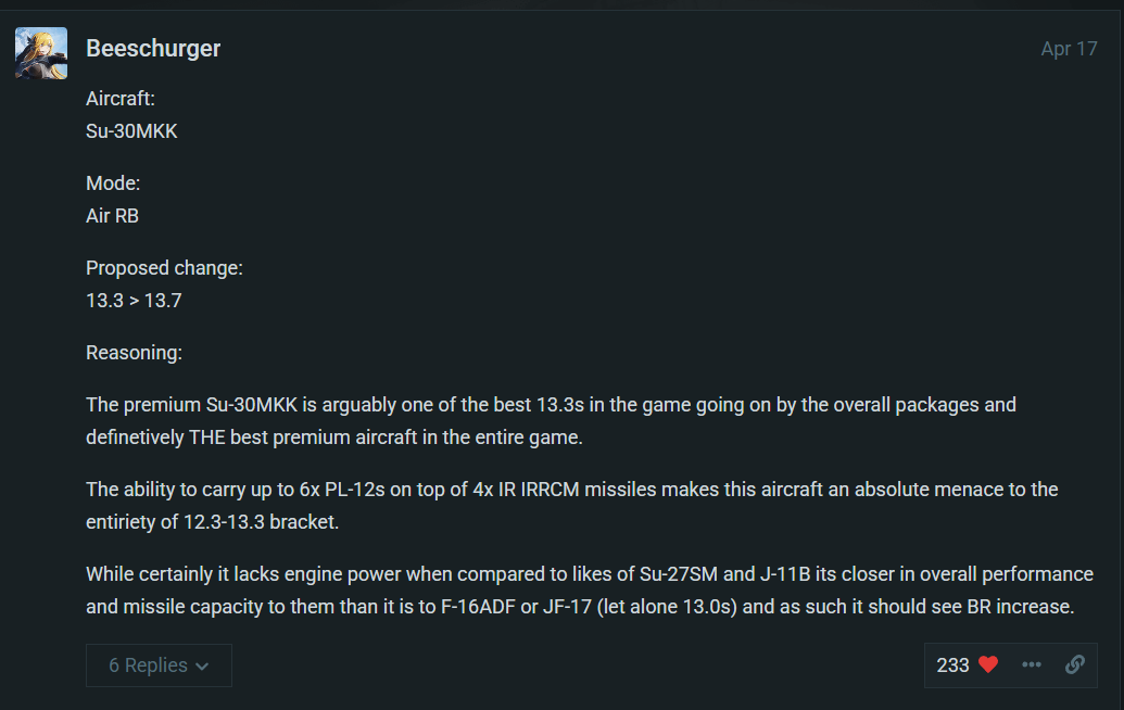 It doesn’t fix BR compression issues like BR 13.0. It doesn’t listen to players regarding SU30 Premium because it makes them money, and it simply follows their Excel spreadsheet to modify BRs, never taking into account the general opinion of the community.