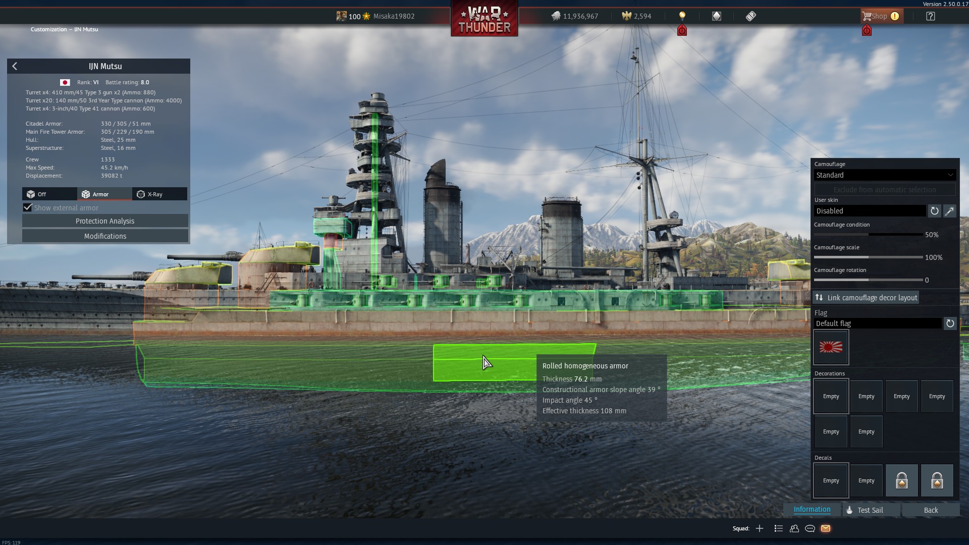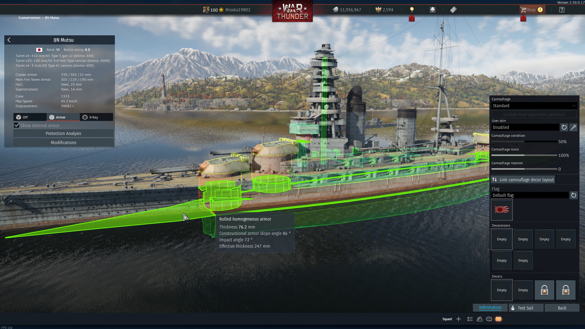 Most part of those ‘rolled homogenous armor’ on Mutsu are actually not RHA in real life. They are high tensile steel. It is not structual steel, but definitely about half the effectiveness of RHA.
