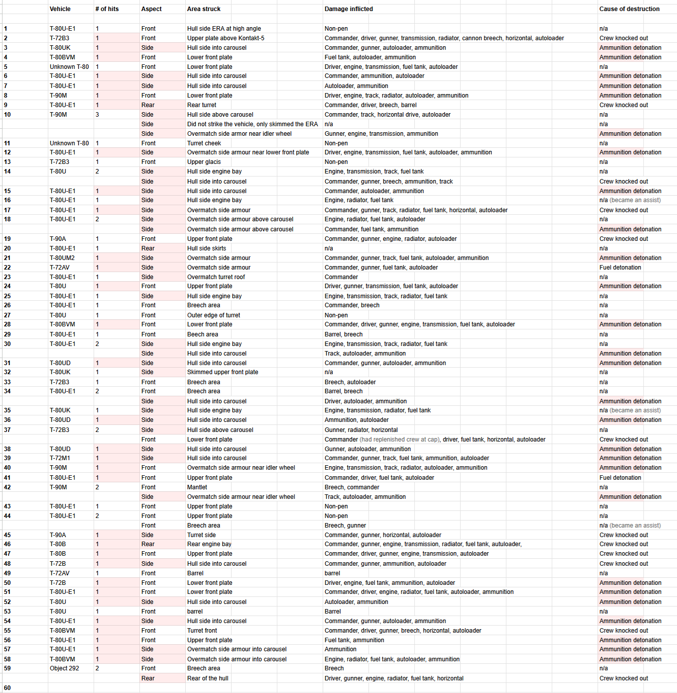 I then compiled each and every shot I took against a Russian/Soviet MBT and compiled the data here: