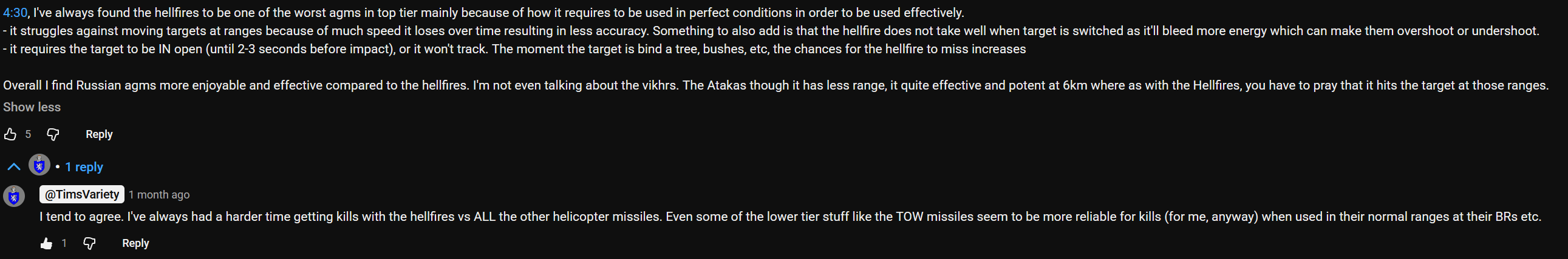 You’re missing the point once again. What makes the Ka52 the best heli prior to the new spaa? It was the vikhrs. It’s the best agm for killing ground and air vehicles. In every of these vehicle tutorial videos, they praise the lethality of the Vikhrs. In almost every video the apaches or other hellfire platforms, they mention how poor hellfires perform due to it’s poor flight characteristics paired with an inferior guidance mode.