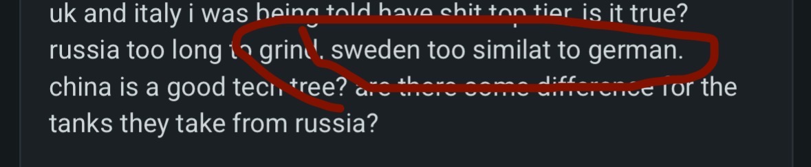 russia too long to grind, sweden too similat to german.