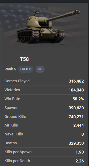 In terms of statistics the T58 is placed #5 of ALL 286 ground vehicles between BR 7.3 and 9.3 for K/D and K/S ratios (December numbers, Statshark).