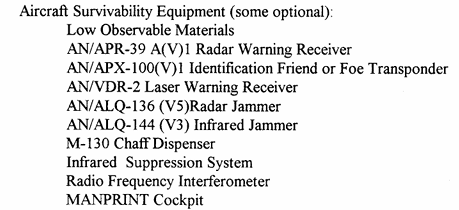 (a). Susceptibility Reduction. All RAH-66 Comanche survivability characteristics shall be optimized, balanced, and integrated. It must employ the balance of passive signature reduction and active countermeasures necessary to close within sufficient range to successfully observe, acquire or engage targets in less time than required for them to successfully engage the Comanche. Susceptibility reduction (e.g., low glint canopy, infrared (IR) suppressing paint and materials, IR suppression of the exhaust gases, reduced visual and acoustic signature, reduced radar cross section) and passive countermeasures (CM) (e.g., radar, missile, laser warning and chemical detection) are required. Active CM (e.g., radar, IR jamming, flares, chaff) shall be applied as necessary to preserve the appropriate balance of passive and active systems necessary for susceptibility reduction. RAH-66 Comanche must meet susceptibility reduction requirements in Appendix F. Application of low observable features must not reduce maintainability and logistical standards." RAH-66 Comanche Operational Requirements Document
