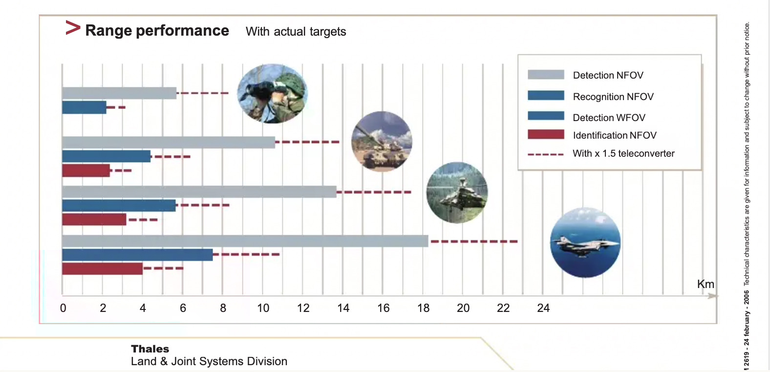 From what I can see, theres a difference between IDENTIFICATION range, RECOGNITION RANGE and DETECTION RANGE. The Catherine FC/X can DETECT targets (tanks in this case) in Wide Field-of-View (WFOV) at a max of 4km vs. 11km in Narrow Field-of-View (NFOV). So, it can tell SOMETHING is there at 4 or 11km