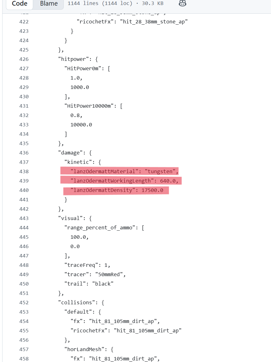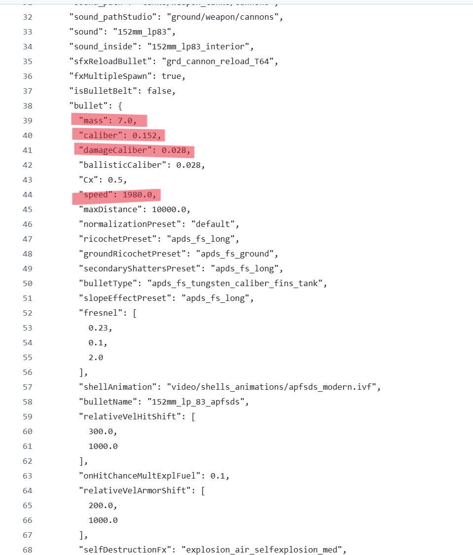 The fourth one is included for reference. The muzzle velocity of the 152mm APFSDS in the game is 1980m/s, but the documentation says that an APFSDS with a muzzle velocity of 1980m/s has a mass of 10kg. To make the APFSDS mass 10kg, the only possible options are to make the diameter extraordinarily thick, around 35mm (assuming the penetrator length is 640mm), or to lengthen it to around 930mm (assuming the diameter is 28mm).
