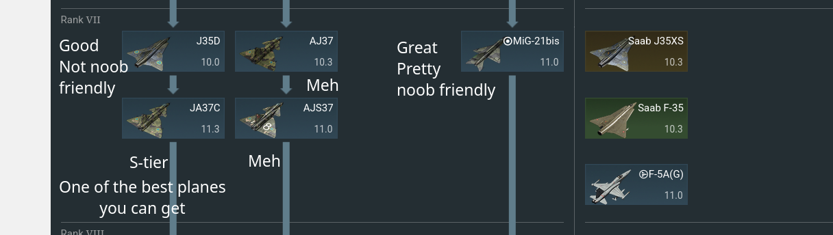 The leftmost line is good, but the draken could be a little difficult since it lacks flares at a high battle rating. If you know which planes carry dangerous missiles you can perform quite well in the draken though. JA37C is an absolutely wonderful plane with good radar missiles and an unbeatable radar at 11.3, almost guaranteed 2 kills per game. The stock grind without radar missiles can be a bit difficult though.