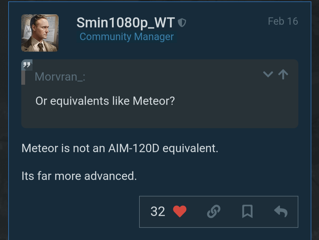 The plane already has the best flight model in the game, the best radar, and rh b at countermeasures suite for a top tier…and you want it to have the meteor already?