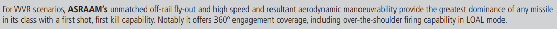 Yeah but bvr for asraam would essentially be useless… if the target changes aspect it side of lock on it has no datalink to fall back on unlike ir missiles with dl like mica ir