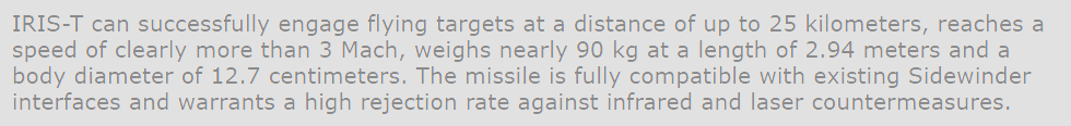 Ngl, Im starting to think most/all statements specifically regarding the IRIS-T’s aerodynamic/kinemtatic performance are internet fabrications to some degree. Even the wiki page, which states “60G at 60°/s” has 2 sources linked that have quite literally 0 mention of either number.