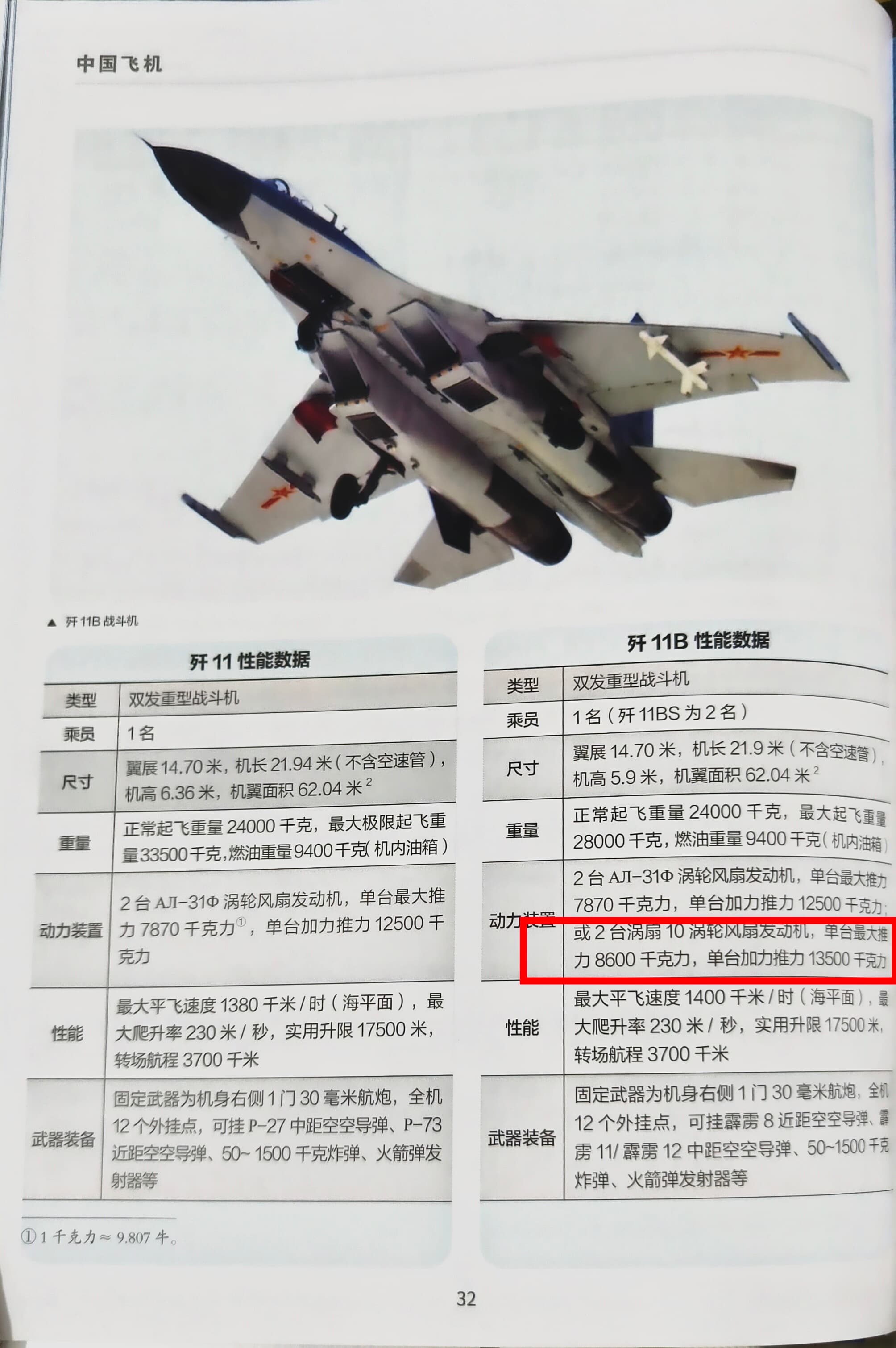 来自航空工业出版社出版的《中国飞机》里面,j11b的涡扇10发动机数据为单台最大推力8600kgf,单台加力推力13500kgf。