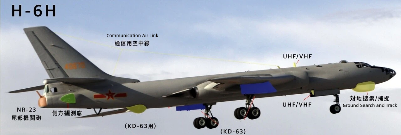 The H-6H is a bomber in China’s arsenal with standoff precision strike capability. In the 1990s, to accommodate the Yingji-63 (KD-63) air-launched cruise missile, China conducted specialized upgrades on the existing H-6 bomber. Compared with earlier H-6 variants, the airframe underwent no major structural modifications. The upgrades primarily included a pulse-Doppler radar, electronic warfare systems, fire control, and navigation systems. The aircraft is capable of carrying two KD-63 air-to-surface missiles, which employ a “man-in-the-loop” guidance mode combined with television guidance. To support this capability, a prominently protruding radar housing was installed under the nose, and a data link pod was mounted beneath the tail section. All defensive cannons were removed, though a small number of variants retained the tail gun. These modifications transformed the H-6 from a traditional bomber platform into a long-range precision strike platform.