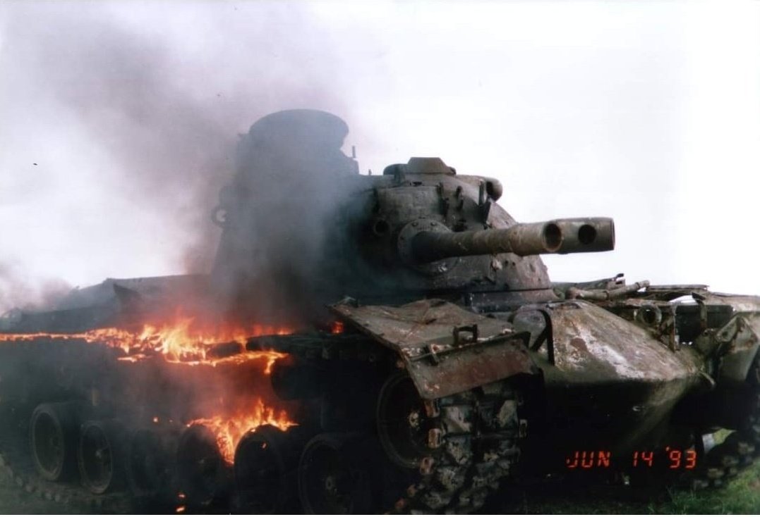 From a German shooting range, many years ago. Decomissioned tank vs Gepard (HEI-T).