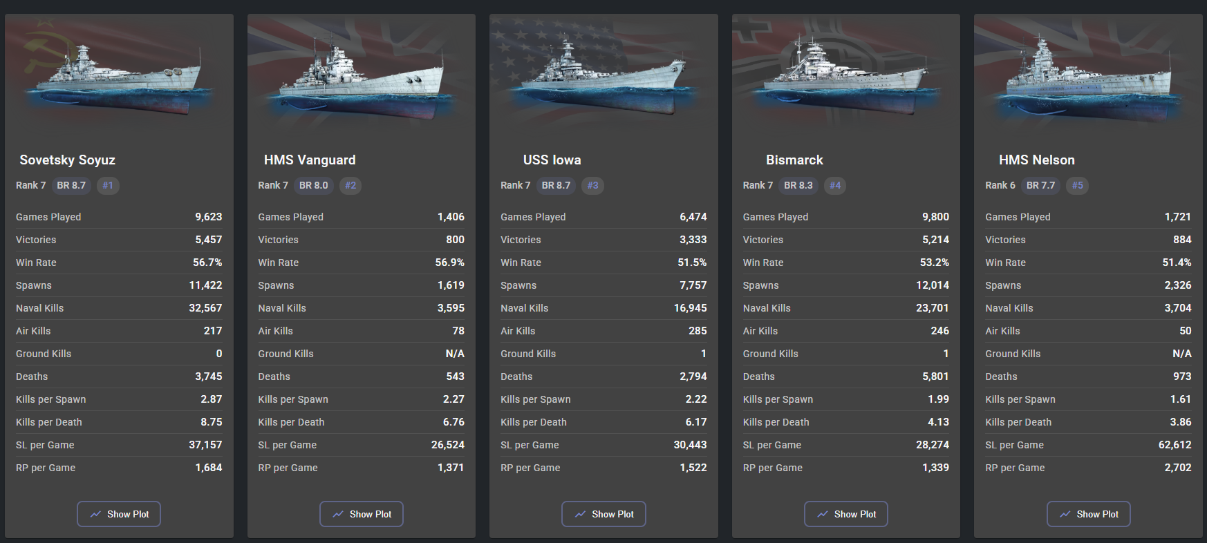 Now let’s interpret what these mean. Higher kill to death and kill to spawn ratio means Soyuz doesn’t die often and tends to bully the other same BR ships. Higher number of battles means that despite being from an objectively unpopular navy, the ship is so strong that nobody else wants to play against it, so it eclipses the others in battles played. The only actual same BR ship in the comparison is Iowa, and she’s so far below Soyuz that even being the best actual ship that sailed under her own power, in a very good navy that fired her guns in anger isn’t enough to make players want to play.