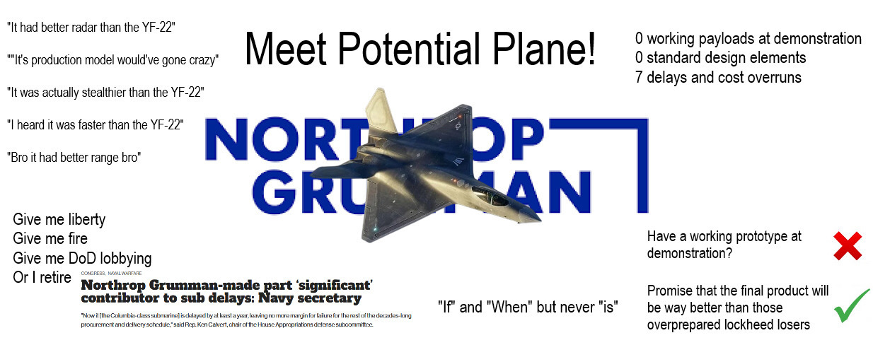 they cannot add the yf-23 to war thunder, they need to add proposed f-23 instead. the problem is that the f-23 is magnitudes times more fiction than something like the yak-141, at least for yak 141 we knew exactly which and how many weapons it would carry, and there’s even pictures of it carrying said missiles. yf-23? It ain’t carry stuff