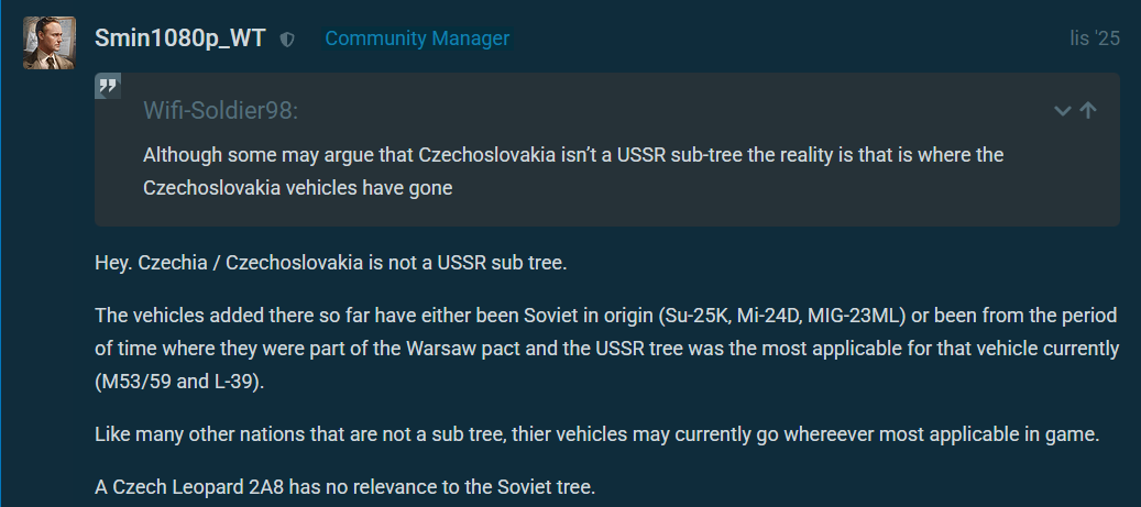 Czechoslovakia would make far more sense, still I personally dont think it would change something, the vehicles would be forgotten or overshadowed by the soviet ones, like “ oh there’s a sub tree, why should i care?” Yet czechoslovakia already has some vehicles in the soviet TT and not only as premiums, actual researchable vehicles, so if they have to add a sub-branch or a few vehicles to the USSR it has to be Czechoslovakia